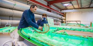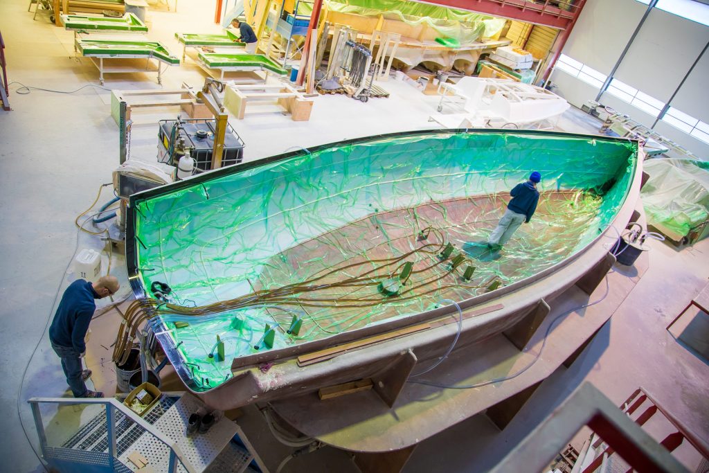 La construction en sandwich et infusion est l’une des plus technologiques et pointues du marché de la construction navale. Dans la stratification traditionnelle, un opérateur vient apposer à la main la résine sur les tissus. Avec l’infusion, plus de contact avec la résine donc de meilleures conditions de travail et une quantité mieux maîtrisée. Concrètement, après avoir empilé les différentes couches de tissus, voire ajouter des pièces de sandwich réalisées majoritairement avec de la mousse, une bâche plastique est tendue hermétiquement sur les tissus. Une pompe aspire l’air entre la bâche et la fibre compactant au passage tout l’échantillonnage. C’est cette dépression qui aspire la résine et la diffuse dans les tissus avant d’attendre quelques heures pour que la polymérisation soit totale et définitive. Résultat : meilleur pour l’environnement, répartition parfaite de la résine et quantité optimale donc une coque, des ponts et des cloisons structurelles légère et rigide.