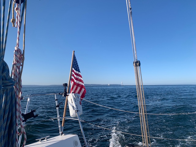 By the time we got race sails off and cruising sails back on, plus all the gear piled, it was late and the wind died. So, we ended up motoring. It was a beautiful day. however and it was just nice to be back on the water again.